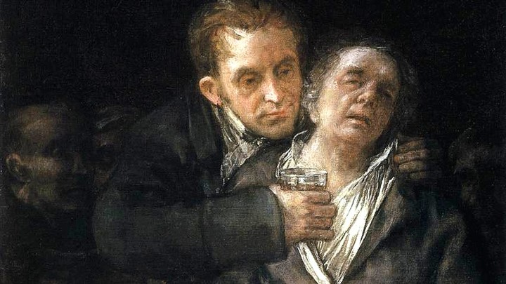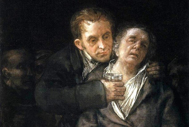 Goya occasionally applied his paints directly to the canvas with his fingers, which Montes-Santiago argues is one reason he experienced problems like constipation, trembling hands, weakness of the limbs, blindness, vertigo, and tinnitus. In his famous 1820 self-portrait, Goya painted himself being embraced by his doctor.