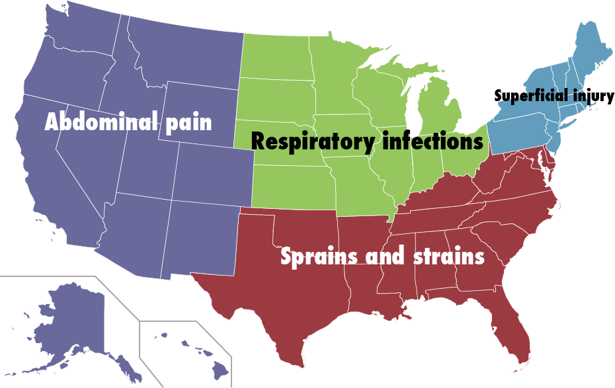 But each state has its unique boo-boos. As you can see from the map above, which I created from new data provided by the Agency for Healthcare Research and Quality, in the South, the most common complaint was a sprain or strain; for the West, it was abdominal pain; and for the Midwest, it was respiratory infections. (Not all states send their ER data to the AHRQ, so the agency lumps them together by region instead.)