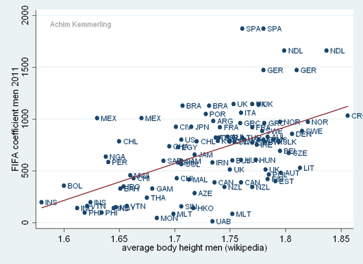 When the data is crunched nationally, however, being shorter doesn't seem to be better for teams as a whole. Using numbers from Achim Kemmerling of the Central European University in Budapest,Chris Anderson of the Soccer by the Numbers blog plotted the average heights of male soccer players by country against the country's FIFA coefficient—basically a measure of how good they are at soccer. Countries above the line play better than their heights would predict; those below the line play worse: