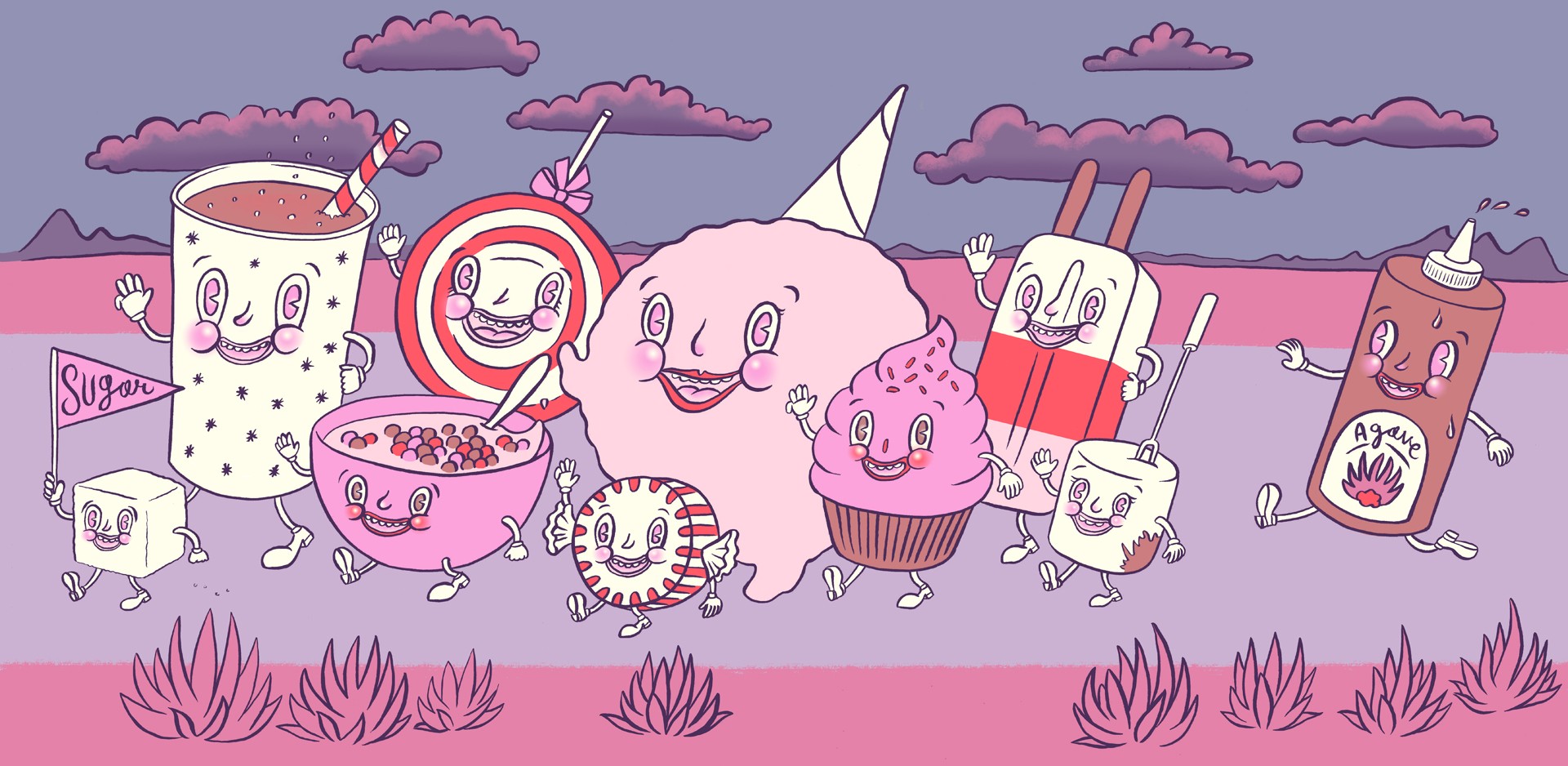 Agave is a plant, but the syrup we make from it is like any sweetener, a mixture of fructose and glucose. After growing for around seven years, a mature blue agave plant sprouts a pyramidal flower that dangles up to twenty feet in the air, where it can be pollinated by bats. The succulent is a relative of yucca, and it was used by people as far back as the Aztec empire. William H. Prescott described agave’s many uses in 1843’s The History and Conquest of Mexico, “The agave, in short, was meat, drink, clothing, and writing materials for the Aztec!” Today in factories the blue agave plant is crushed and its aguamiel (honey water) collected. The natural plant fiber inulin is processed into fructose and glucose using thermal hydrolysis, which involves quickly heating the juice to a high temperature and then cooling it. (In the case of agave that is sold as “raw,” the hydrolysis happens at a lower temperature for a much longer time.) The process yields a product amber in color, with a consistency like maple syrup and flavor like honey, only more delicate. Despite the processing it undergoes, the plant origins made agave popular as a sweetener in “natural” and “wholesome” nutrition bars, sugary drinks, and other foods.