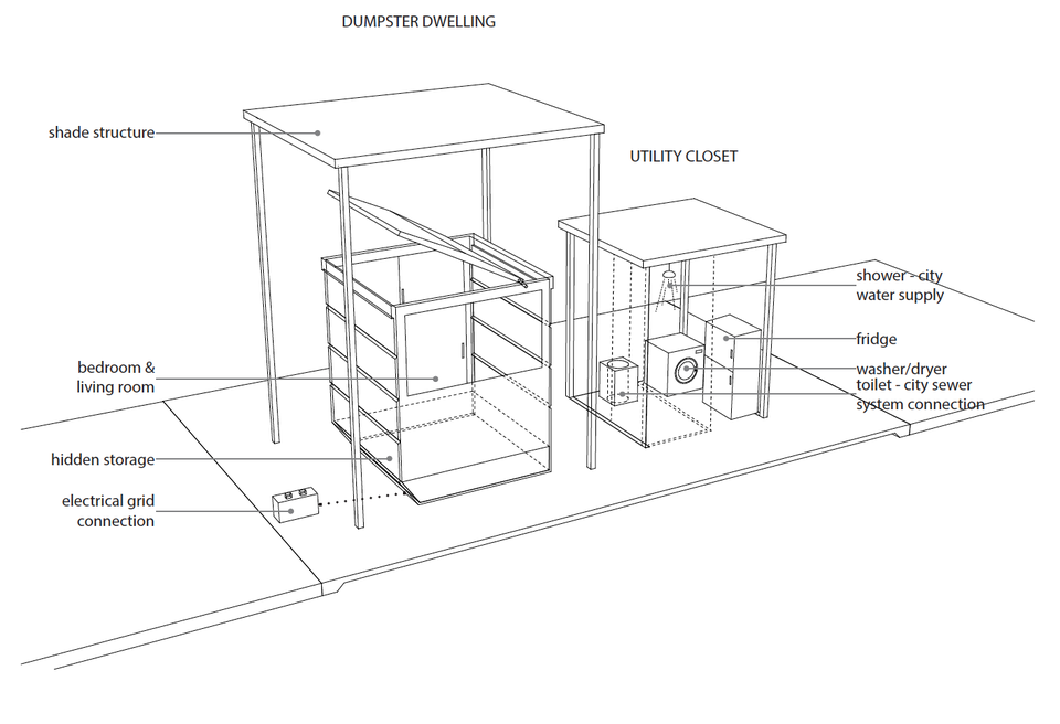 Perks like insulation will come, allowing the small air conditioner to keep pace with the Texas sun. The second phase of The Dumpster Project, which Wilson and collaborators call the “average American dumpster studio,” will incorporate more amenities including a bed, a lamp, and a classic home-evoking pitched roof that will slide back and forth to allow ventilation, weather stripping, and locks (making this possibly the only dumpster in the world with interior locks). Eventually, the dumpster will have a dome to catch rainwater and provide shade, as well as a (tiny) sink and kitchen.