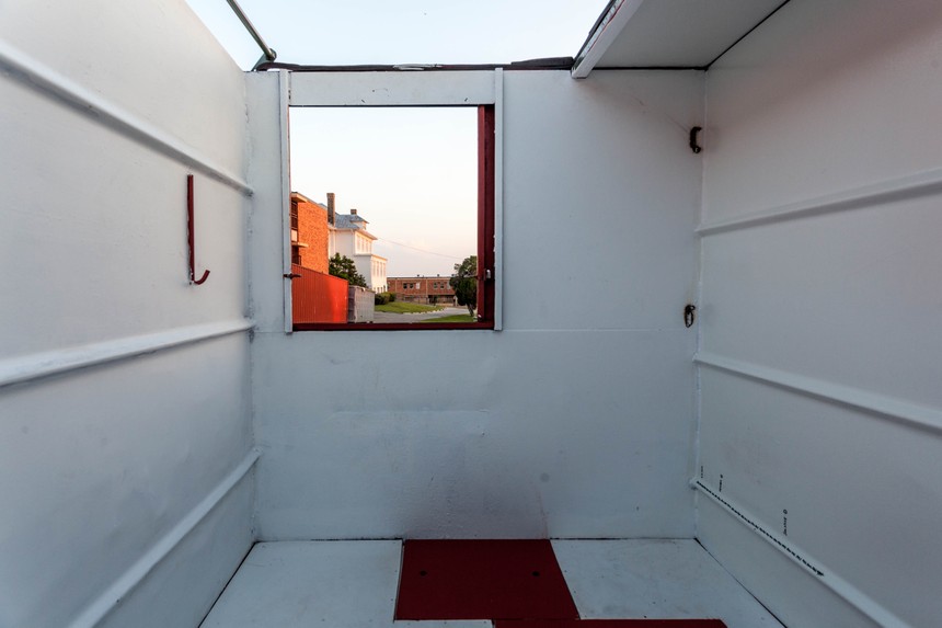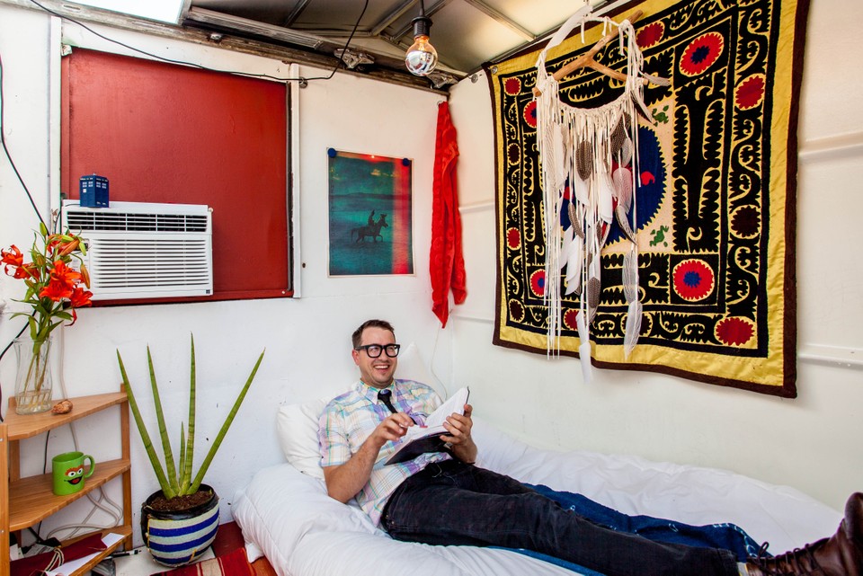 Until this summer, the green dumpster was even less descript than it is now. There was no sliding roof; Wilson kept the rain out with a tarp. He slept on cardboard mats on the floor. It was essentially, as he called it, “dumpster camping.” The goal was to establish a baseline experience of the dumpster without any accoutrements, before adding them incrementally.