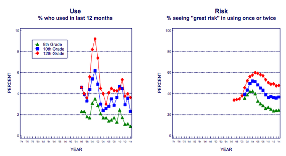 "Ecstasy (MDMA) use showed a statistically significant decline in 2014. For the three grades combined use in the prior 12 months dropped from 2.8 percent in 2013 to 2.2 percent in 2014. In 2001, the peak year of use, the rate had reached 6 percent."