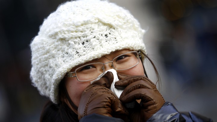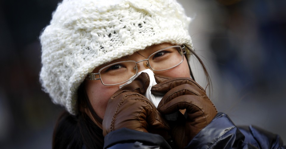 A tourist from Shanghai, who is suffering from a cold, blows her nose during a freezing cold afternoon in Frankfurt on January 31, 2012. Kai Pfaffenbach / Reuters