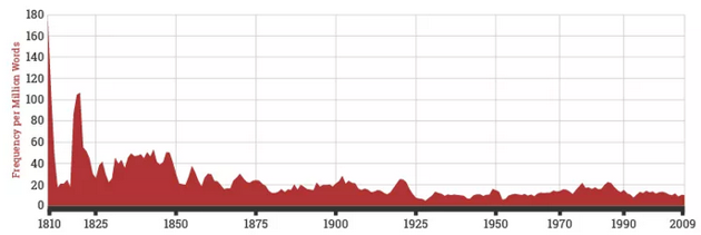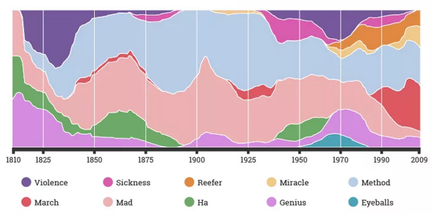 The word mad has been used to mean insanity or dementia since the 1500s, but over the past couple centuries, it’s been been used more as a general descriptor of a concept or personality than an indicator of mental illness: “Writers have speculated about potential links between genius and madness and lamented the madness of violence,” the report reads, and “in certain books, villains are portrayed as mad.” (Based on the frequency of the word ha, it seems those villains apparently have a tendency to laugh maniacally; from the 1950s through the 1980s, they apparently also conveyed their villainy through their eyes.)