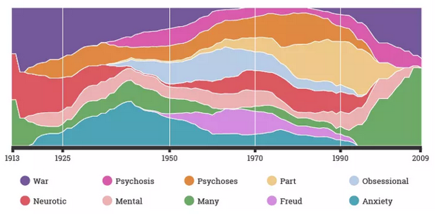 A new report from the research firm Fractl examines the ways in which these words have changed over the past 200 years. For the report, researchers looked for appearances of 21 mental-health-related terms in the Corpus of Historical American English, a collection of 115,000 texts from 1810 to the present, totaling around 400 million words. For each term, they also examined the 10 words that most often appeared nearby.
