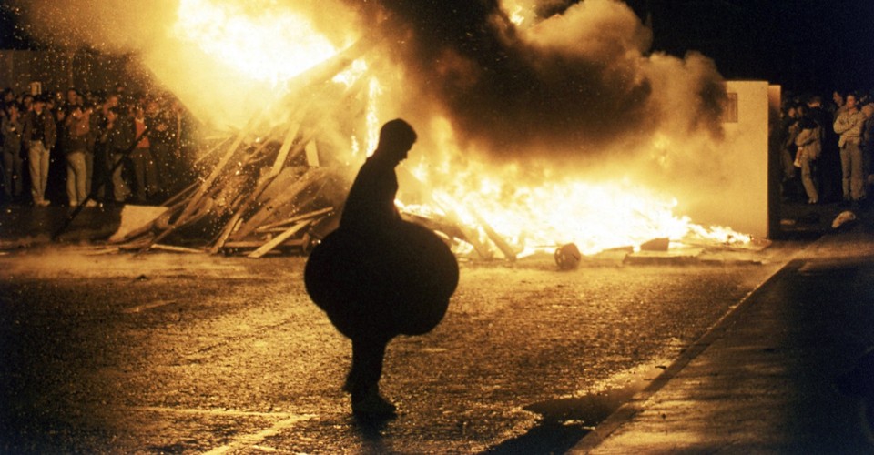 A bonfire burns in the Bogside area of Londonderry, Northern Ireland, in 1989.Dave Caulkin / AP