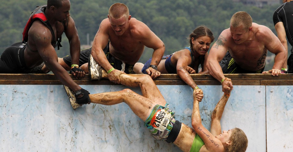 The professional endurance athlete Amelia Boone, who is both a Spartan and Tough Mudder world champion, agrees with the communal explanation for OCRs’ appeal. “There’s something to be said for shared suffering,” Boone said. “When most people run their first Spartan race, as I did when I started out, you sign up with friends or family and you do it as a team. You see people helping each other over obstacles. In a 5K [road race], there might be verbal encouragement, but nobody is literally pushing your ass over a wall.”