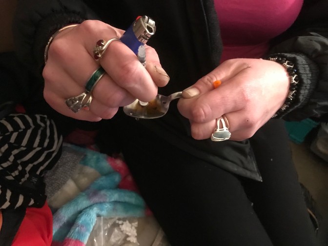 Everyone at the needle exchange has a story about the life-altering moment they first injected drugs. A 30-something woman with wavy brown hair says that six months ago, before she started injecting meth, she was a “soccer mom” with a husband and kids, living in a nice home. Now she’s squatting in an abandoned building, waiting until the police discover her and kick her out. Another woman says she’d never tried drugs before a doctor prescribed her opioid painkillers. After her prescription ran out, buying pills cost her $200 to 300 a day. She started using heroin because it was cheaper, only $100 a day.