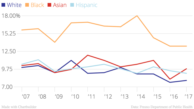 Researchers say that birth outcomes are not just a barometer of a mother’s health, but the health of the community, and also a predictor of its next generations’ health. In many places, adverse birth outcomes can be traced to a history of segregation and economic inequality. Fresno County’s rates of preterm birth (identified as babies born before 37 weeks in gestation) have ranked among the highest in the state. However, these rates vary widely by location and race within the county. In one southwest zip code where black and Hispanic people make up 70 percent of the population, the preterm birth rate is 12 percent. Just 12 miles north of that zip code, the population is 66 percent white and just over 15 percent black and Hispanic. There, the rate is under seven percent.