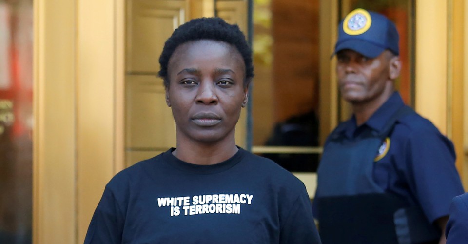Whereas Okoumou is at most guilty of three misdemeanors. (On Thursday, she pleaded not guilty to charges of trespassing, disorderly conduct, and interference with government-agency functions.)