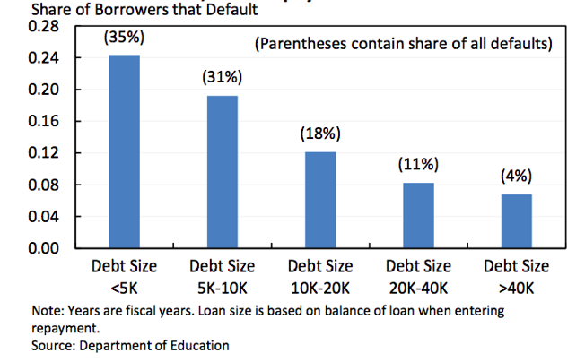 In fact, that’s just how the economy works. Borrowers with more than $40,000 default account for just 4 percent of those in default, in part because they’ve often accumulated that debt through graduate programs that deliver a reasonably high level of income. But borrowers with less than $5,000 in debt default are far more likely to default, because they’ve often attended a less-prestigious school or dropped out of college entirely, accumulating debt without increasing their earning potential.