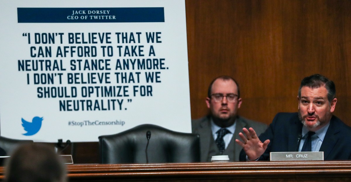 Like many loud voices in his party, Cruz has suspended that habit of evidentiary discrimination in recent years. Earlier this month, he and a fellow Republican senator, Josh Hawley of Missouri, urged the Federal Trade Commission to investigate Twitter, Facebook, and Google for alleged anti-conservative bias in content-moderation practices and the ways algorithms prioritize some types of content over others.
