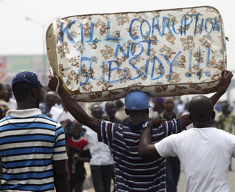Nigerian protesters carry a mattress, on which "Kill corruption not subsidy" is written / Reuters