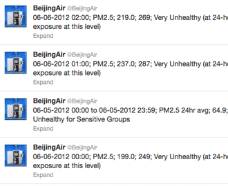 You can get all the background you would ever want with this series of posts: one in 2009 that represented my first sighting of @BeijingAir; a followup shortly thereafter; an article in the magazine in 2009; a web item in November, 2011; and this heartbreaking/frustrating one also from last November, in which Chinese authorities explained why they weren't providing the PM 2.5 readings themselves. (Most Chinese readings are of the larger and less dangerous particulate pollution known as PM 10.)