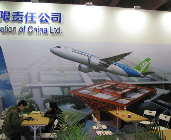 At the high end, as a hoped-for eventual rival to Boeing and Airbus, there is the C919 from the Chinese state aerospace company Comac. Part of its display at the same Hong Kong airshow, depicted flying over the Chinese pavilion from the Shanghai World Expo.