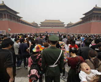 When you do that, please remember that the "jing" in Beijing is pronounced basically like the "jing" in Jingle Bells. It's essentially the normal English j- sound. What it's not like is the Frenchified zh- sound you hear in "azure" or "leisure," or at the end of "sabotage." (Jīng, meaning capital, is the right-hand character above. The other is Běi, meaning north.)
