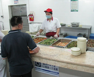 Lunch line in the same building. A company official told me, "Our priorities for the food are: Number 1 Safety, Number 2 Cleanliness, Number 3 Nutrition, and Number 4 Taste. Sometimes the employees really care only about Taste."
