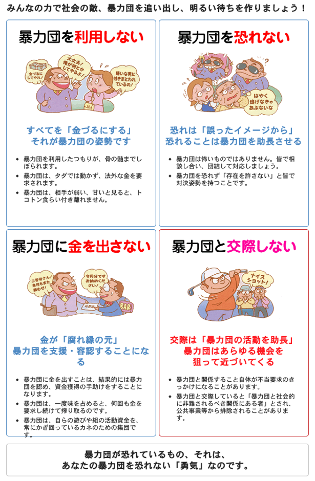 Police sources acknowledge on background that there may be more companies who actually paid off the yakuza than were willing to admit it in a police survey. In October of 2011, it became a crime in Japan to make payments to the yakuza or utilize their services under the organized crime exclusionary ordinances (暴力団排除条例). The NPA produces posters like the one at right warning people not to give in to yakuza extortion demands