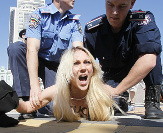 "The FSB interrogated us," she said. "They wanted to know if the CIA was paying us, telling us we had to stand in Slavic solidarity against the Americans ." The authorities finally declared her persona non grata and deported her. She is wanted in Ukraine, too, for "desecrating a state symbol" -- the Indian flag -- which she used to pummel the door of the Indian embassy in Kiev during a protest against restrictive visa policies that presuppose, she said, that all Ukrainian women are prostitutes -- "an insult to our mothers and to us."