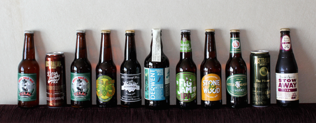 Until just now. The picture at the very top of this item shows an 11-beer range of craft beers. They run from Hop Hog IPA, made by the newish Feral Brewing Company in Western Australia (at far left), to Stowaway IPA from the better-known James Squire Brewery in New South Wales (at right). I bought all those bottles and lugged them home on a visit a few months ago to the wonderful Oak Barrel bottle shop in Sydney, below.