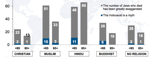 When the data is sliced by religious groups, the results are even more surprising: Hindus were most likely to believe that the number of Holocaust deaths has been exaggerated. Muslims followed closely, and those two groups were distantly trailed by Christians, Buddhists, and those with no religion. In no coincidence, Hindus and Muslims were also significantly less likely to have heard of the Holocaust.
