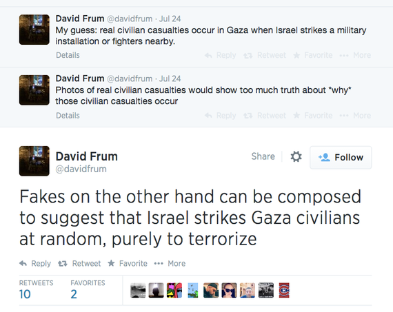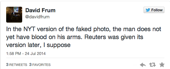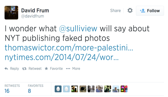 1. A colleague at TheAtlantic made a major journalistic error this week. As he has himself admitted, in the first half of a post on our site. Of course, I am talking about David Frum, who sent out a series of tweets that flat-out and falsely claimed that The New York Times had highlighted a “faked” photo of Palestinian casualties. Frum was entirely wrong; the photo was all too real; and now Frum has apologized, to the photographers and for his snap misjudgment.