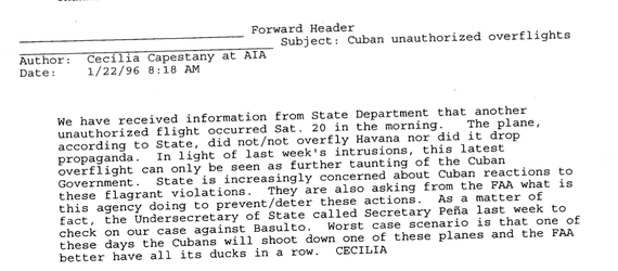 In the weeks, days, and hours before the final confrontation in the skies off Cuba's coast, some U.S. officials sensed a calamity was coming. In January, U.S. military radar picked up evidence that the Cuban air force was practicing intercepting and firing on slow-moving aircraft. Alarmed State Department officials peppered the FAA with requests for action. "State is increasingly concerned about Cuban reactions to these flagrant violations," wrote Cecilia Capestany, an official at the FAA's international-aviation division, on January 22, 1996. "Worst-case scenario is that one of these days the Cubans will shoot down one of these planes ...”