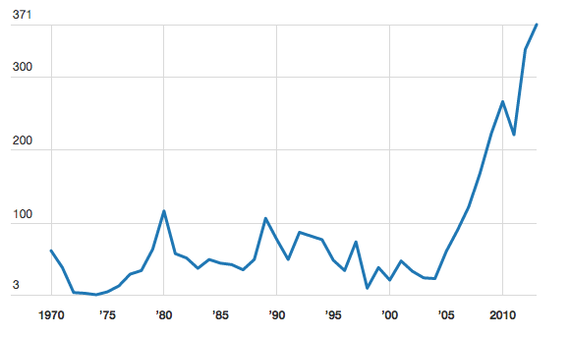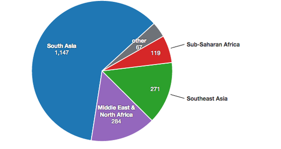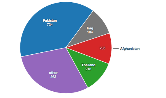 And that increase, like the more general spike in terrorist attacks around the world, has fallen disproportionately on a few regions, namely South Asia and the Middle East. Though recent years have brought the rise of Nigeria's Boko Haram, which explicitly condemns Western education and conducted one of the biggest school attacks of the past decade when it kidnapped nearly 300 schoolgirls this spring, it is extremists in Pakistan and Afghanistan in South Asia, along with Iraq in the Middle East, who are largely driving the growth in terrorist targeting of schools. (In the country pie chart below, Nigeria is included in the "other" category. Thailand has also witnessed a high number of terrorist attacks on schools, as Muslim separatists in the country's south have targeted Buddhist teachers in government-run institutions.)