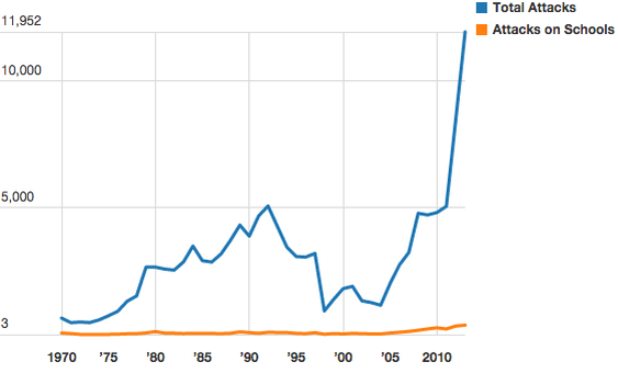 There are caveats to these statistics. Erin Miller, program manager for the Global Terrorism Database, told me that as better resources have become available over time, the database has been able to verify and tally more terrorist attacks, so its numbers may overstate the increase in attacks overall, including attacks on educational institutions. But, she said, "We certainly believe that there's a large chunk of that increase [in attacks on schools] that's real."