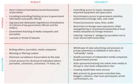 This combination of traditional and innovative methods has created a more varied menu of censorship than ever before. Stealth censorship appeals to authoritarian governments that want to appear like democracies—or at least not like old-style dictatorships. In illiberal democracies, of which there are a growing number, the government aims to keep a grip on the news media while concealing its fingerprints. A global survey of attacks on the press today shows governments mixing direct and indirect pressures as part of a booming emerging market in information control.