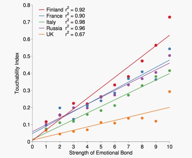 There wasn’t a significant amount of cultural difference in where participants would allow family, friends and strangers to touch them; but some nationalities were less enthusiastic about touching than others. True to their stereotype, British participants were right at the bottom on the touchability index. And to the researchers’ surprise, Italians were less comfortable with being touched than Russians.