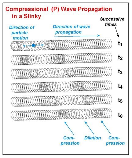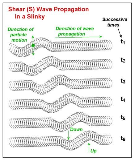 Lay a Slinky on the floor, grab one end, and move it back and forth to create a wave that propagates down its length. This is called shear wave propagation, the kind created by tectonic plates slipping beneath the surface of the earth. “That side-to-side motion, you’ll get less of it in an explosion,” said Earle.