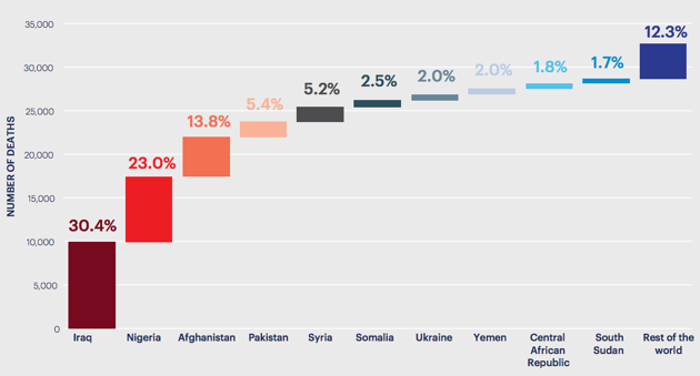 The institute reported that Iraq and Nigeria accounted for more than half of all terrorism deaths in 2014, and that the 9,929 terrorism-related fatalities in Iraq constituted the highest annual total ever recorded in a country—three times as many deaths from terrorism as had occurred in the entire world in 2000, the year prior to the 9/11 attacks. Iraq and Nigeria, the organization noted, are also home to the world’s two deadliest terrorist organizations: ISIS and Boko Haram, respectively.