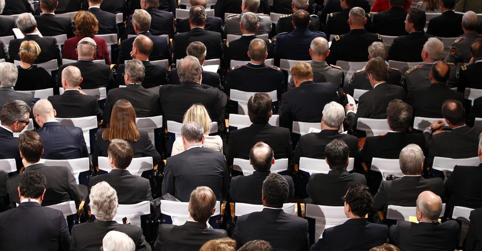 The conference was originally called Wehrkunde (loosely translated as “military affairs”), and since 1963 it has met almost every year in Munich. The picturesque old Bayerischer Hof Hotel, where the event is held each year, becomes a seething mass of nearly 700 politicians, businesspeople, pundits, and officers, all eyed coldly and shoved out of the way by squads of contemptuous bodyguards. Attendees not eminent enough to have reserved seating often cannot elbow their way to the policy wonk mosh pit that the conference floor morphs into. The bathrooms can barely handle their traffic, and the hotel takes on the moist warmth and stale air of an aging high school gym. But still they come, now in the many hundreds, slowed by the officious motorcades of the truly important, trudging past half a dozen security cordons manned by thousands of vigilant German police.