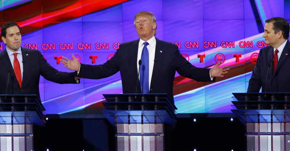 And, oh yeah, there were those two other guys on stage: John Kasich and Ben Carson. Kasich got the most attention of the two of them, occasionally jutting in to deliver a long, wonky answer, but he was largely shut out of the Trump-Rubio-Cruz fight, which isn’t a good sign for his chances going forward. Carson, never a strong debater, was a particularly spectral presence Thursday, hardly ever getting a word in edgewise and at one point begging to be attacked so he could talk. Carson did, however, manage to coin an incredible phrase when describing his litmus test for Supreme Court nominees: “The fruit salad of their life is what I will look at.” (Your guess is as good as anyone else’s.)