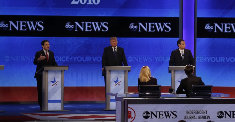 This debate didn’t seem very consequential to me. Everyone on TV is saying that Marco Rubio did terrible. That wasn’t my takeaway. If anyone helped himself I would guess Jon Kasich, if only because he seemed to get more speaking time tonight than normal. I can imagine the Donald Trump exchange on eminent domain hurting him, especially if it’s packaged into television attack ads. And it seems perfectly suited for that.