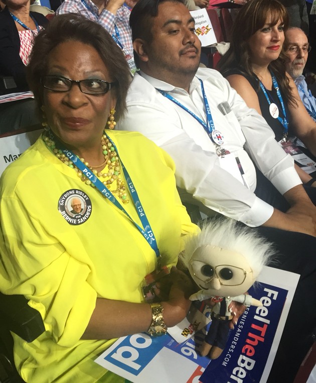 Shyrone Ridley, an alternate delegate in the Maryland delegation who supports Sanders, brought a Bernie Sanders doll with her that she calls Lil’ Bernie. She’s been waving it in the air during the roll-call vote whenever the delegate count for Sanders gets higher. Ridley said she feels sad at this moment, but she is confident that the movement the senator started won’t end. “This is only the beginning,” she told me.