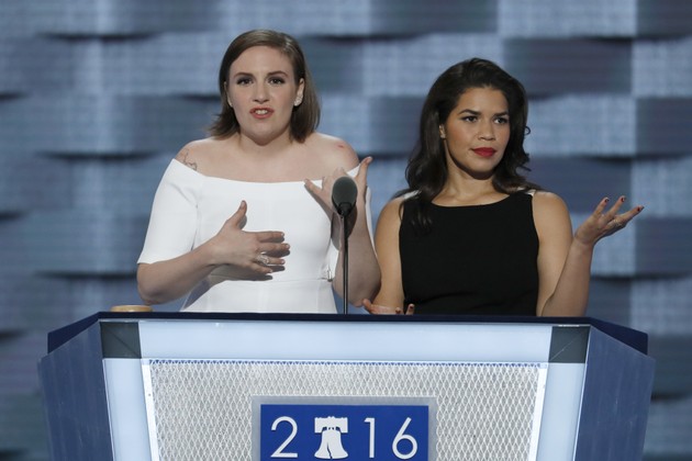 Lena Dunham and America Ferrera each took a shot at Donald Trump in their DNC remarks. “I’m Lena Dunham, and according to Donald Trump, my body is probably like a two,” Dunham said. Ferrera followed: “I’m America Ferrera, and according to Donald Trump, I am probably a rapist.”