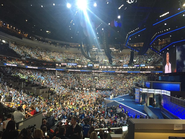 The television screens at the convention just informed the audience that later in the evening, those present will have a chance to perform what they’re calling a “card stunt.” Each member of the audience seems to have been given some kind of placard to hold up at a designated time that presumably will either spell out some kind of message or create a tapestry-based image. It seems like this has the potential to go wrong, especially if Bernie Sanders supporters don’t want to participate.