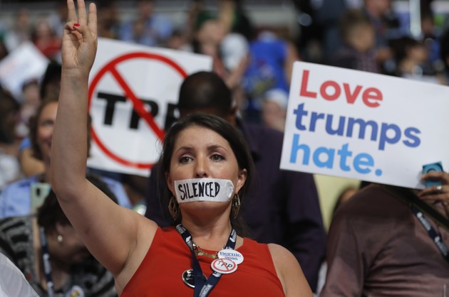 I spent a few hours talking to pro-Sanders supporters today and I saw several of the same “Hillary For Prison” signs and shirts that were so common in Cleveland. Even more indicative of some rhetorical creeping, the slogan #DemExit was common among some protest groups, in an attempt to mirror the sentiments behind Brexit. The Brexit vote in Great Britain was critiqued by many as a capitulation to xenophobia. It was certainly strange to see slogans criminalizing an opponent and embracing a signpost of xenophobia in a group of liberal protesters.