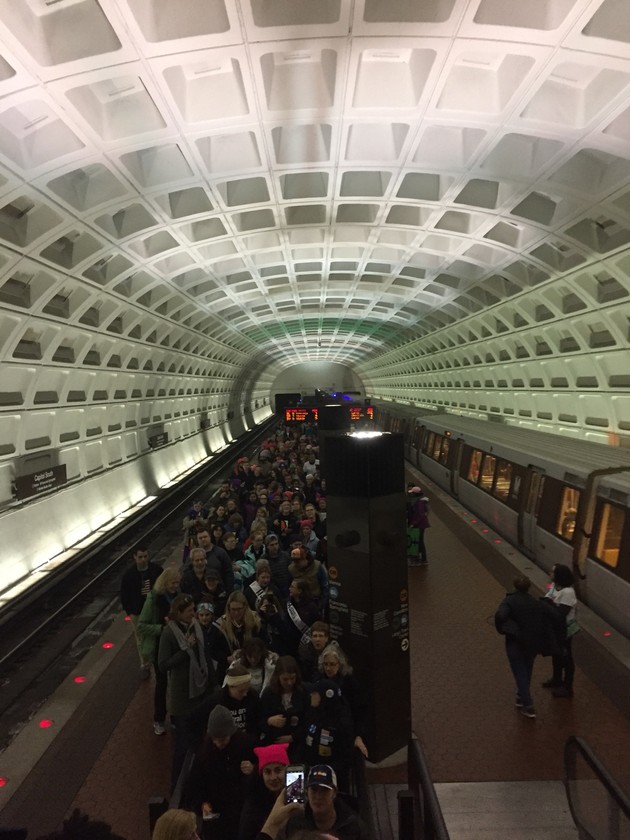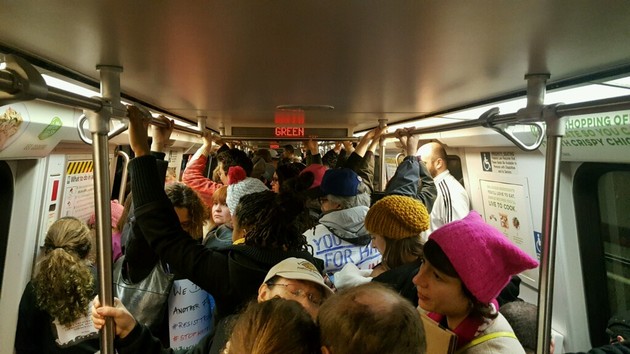 I’m riding on the Metro’s Green line from the station in Petworth, to the north, to the L’Enfant station, in the south, and the train is holding for 5 to 10 minutes at each stop. The conductor keeps repeating that "due to amazing, outstanding turnout, we are holding to make room for people." Riders aren't mad—at least not yet—even though the Women’s March rally is already under way. They keep cheering when he says "amazing turnout."