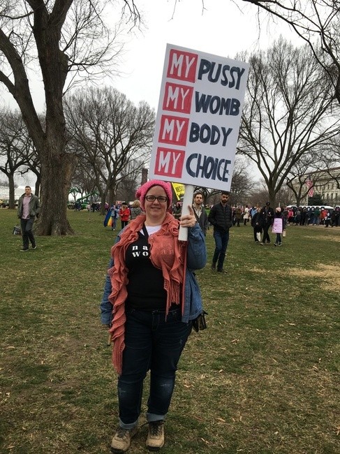 Her sign was inspired by Trump’s words in the Access Hollywood video, she said. “Instead of it being a vulgar word, it being a word of empowerment for women. Everything about my person is for me to decide.”