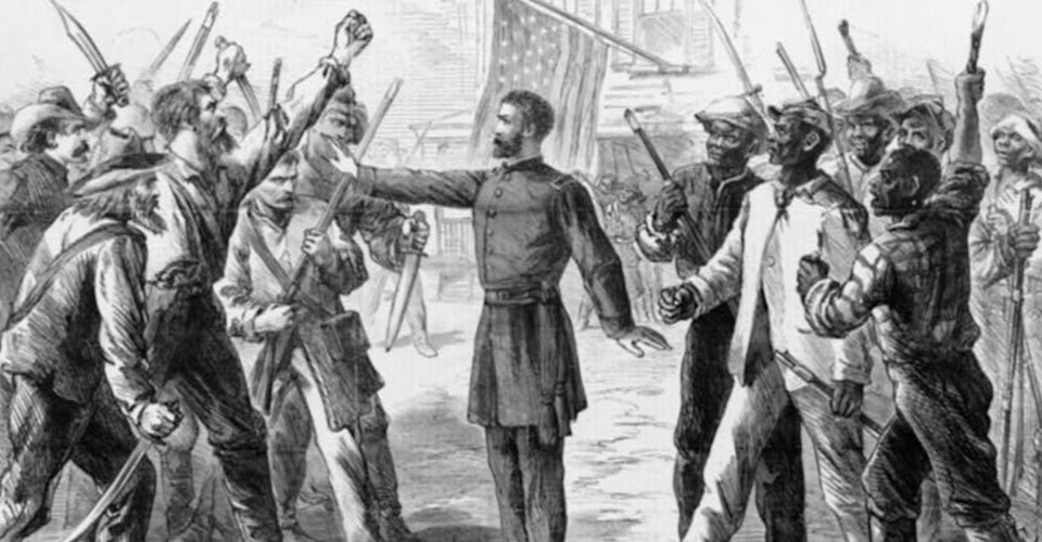 Then the long-headed man, with care-chiseled face, who sat in the White House, saw the inevitable, and emancipated the slaves of rebels on New Year’s, 1863. A month later Congress called earnestly for the Negro soldiers whom the act of July, 1862, had half grudgingly allowed to enlist. Thus the barriers were leveled, and the deed was done. The stream of fugitives swelled to a flood, and anxious officers kept inquiring: “What must be done with slaves arriving almost daily? Am I to find food and shelter for women and children?”