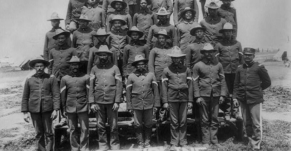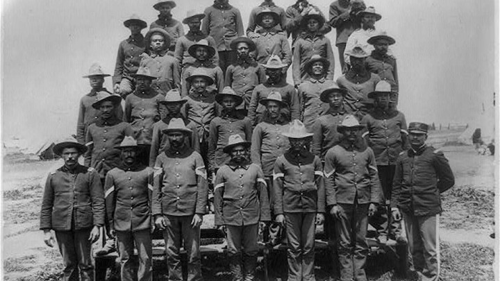 It was not until the battle of Santiago, however, that the bulk of the American people realized that the standing army comprised regiments composed wholly of black men. Up to that time only one company of colored soldiers had served at a post east of the Mississippi. Even Major, later Brigadier-General, Guy V. Henry’s gallop to the rescue of the Seventh Cavalry on December 30, 1890, with four troops of the Ninth Cavalry, attracted but little attention. This feat was the more remarkable because Major Henry’s command had just completed a march of more than one hundred miles in twenty-four hours. But in the battle at Santiago, the four colored regiments won praise from all sides, particularly for their advance upon Kettle Hill, in which the Rough Riders also figured. From the very beginning of the movement of the army after its landing, the negro troops were in the front of the fighting, and contributed largely to the successful result. Although they suffered heavy losses, especially in officers, the men fought with the same gallantry they had displayed on the plains, as is attested by the honors awarded. In every company there were instances of personal gallantry. The first sergeants especially lived up to the responsibilities placed upon them. The color sergeant of the Tenth Cavalry, Adam Houston, bore to the front not only his own flags, but those of the Third Cavalry when the latter’s color sergeant was shot down. In several emergencies where troops or companies lost their white officers, the senior sergeants took command and handled their men in a faultless manner, notably in the Tenth Cavalry.