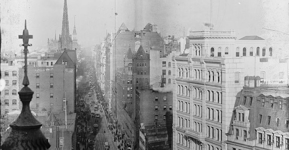 Fifth Avenue (below the Park) has lost its restful, if sombre, brown-stone unity by its unconditional surrender to retail trade. The formerly compact “Tenderloin” has been harried into spreading its unsavoriness over an indefinite area. The ancient slovenliness of upper Broadway has been emphasized instead of relieved by the gorgeous caravansaries with which it is dotted.