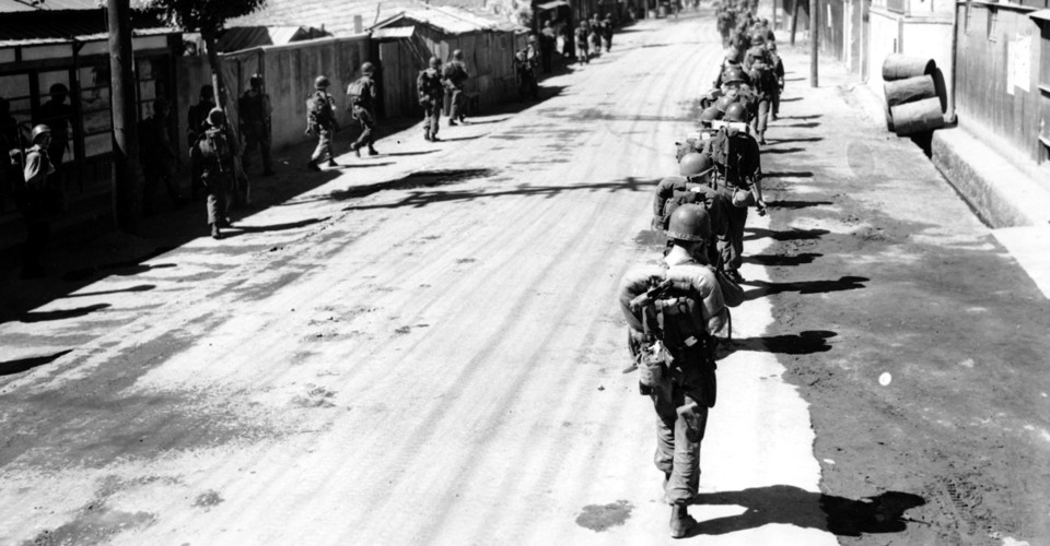 When at last, in late summer, two additional divisions were landed behind the enemy lines at Inchon, the show, in so far as American field strength was concerned, was all but complete. One more division was added in the hour when the seemingly shattered Communist enemy was being pursued to the Yalu River. Strategy was then at its wishful best; it was wishing out of existence a Red Chinese Army which was already over the border.