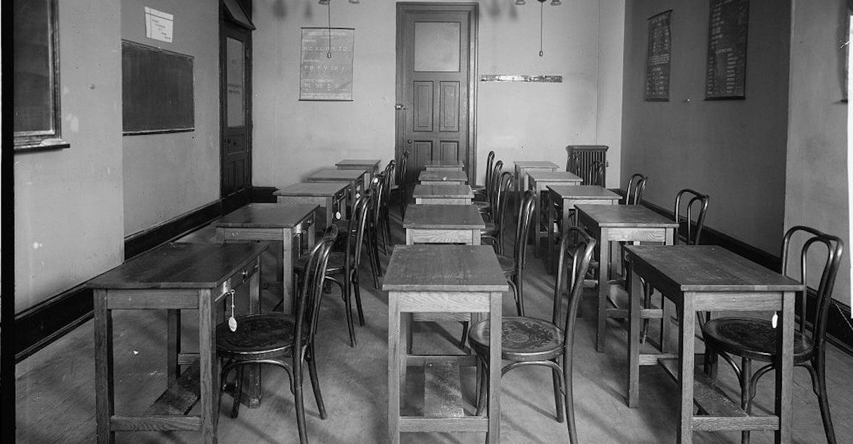 You check around the classroom. Of forty desks five have tops with no hinges. You lift a desktop to fetch a paper, and you find the top has fallen off. There are three windows: one can’t be opened. A sign on it written in the messy scribble of some custodial person warns: “Do Not Unlock This Window It Is Broken.” The general look of the room is that of a bleak-light photograph of a mental hospital. Above the one poor blackboard, gray rather than really black, and hard to write on, hangs from one tack, lopsided, a motto attributed to Benjamin Franklin: “Well begun is half done.” So much within this classroom seems to be a mockery of itself.