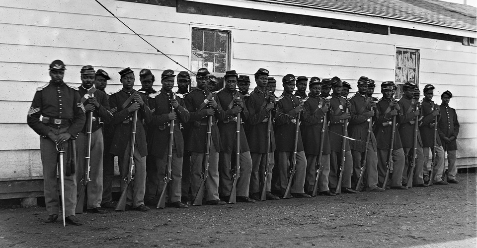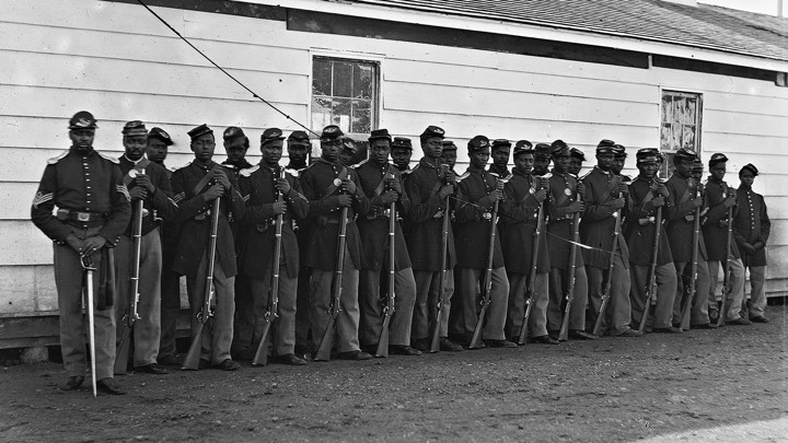 Members of Company E, Fourth U.S. Colored Infantry Regiment, pictured at Fort Lincoln, in Maryland. The regiment, which was organized in Baltimore after the war broke out, lost nearly 300 men. (Library of Congress)