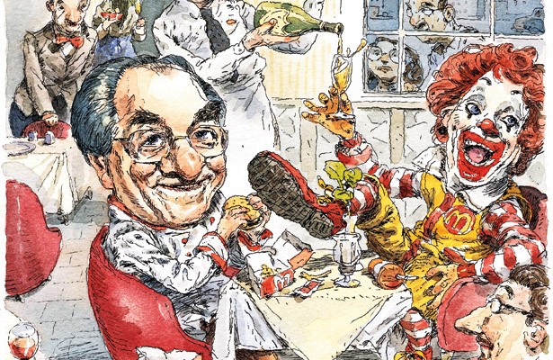 Marchesi had come to our appointment straight from the dentist, and after a few minutes he decided he needed to take a painkiller. He hadn’t planned to eat, but he didn’t want to swallow the pill on an empty stomach, and so he reached for the McDonald’s bag and pulled out its contents. The maître d’ materialized by the side of the table. Marchesi handed him the bag, but kept the boxes. “Leave it all here,” he said. “Let’s do a bit of advertising.” He opened the box containing the Vivace. “I’m Milanese,” he said. “So I like this one better, the one with the mayonnaise. It gives me the desire to eat one.” He looked up at the maître d’. “Can I?,” Marchesi asked. “At least try how it is?” He hunched his shoulders, darted his eyes theatrically, and gave the burger a big bite. “Buono,” he said. He turned to the table next to ours and added: “I’m reduced to eating my own hamburgers.”